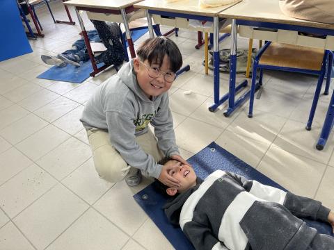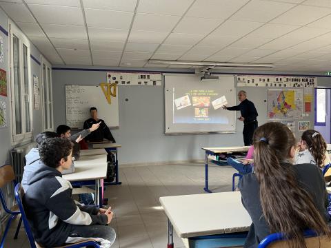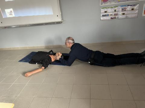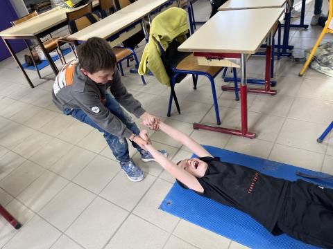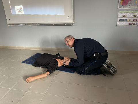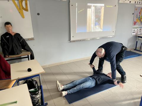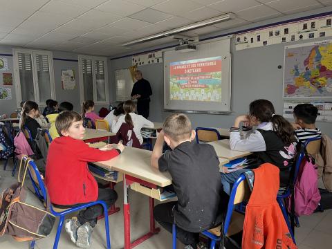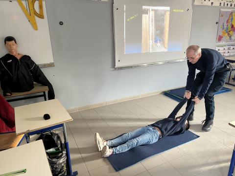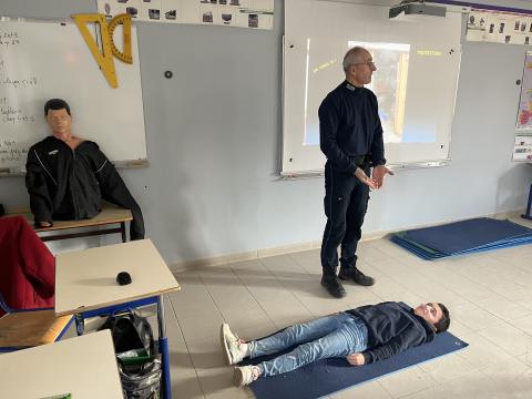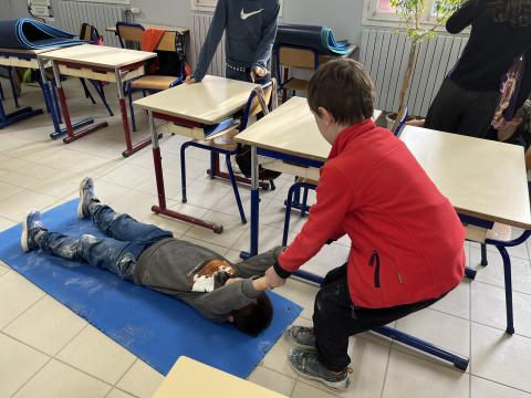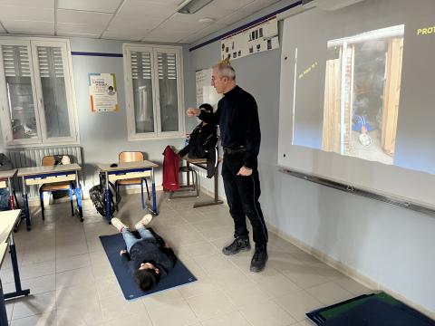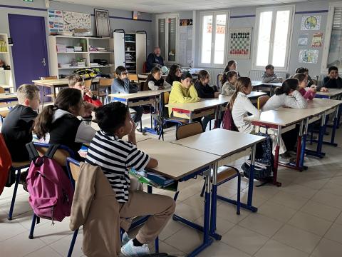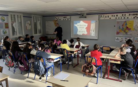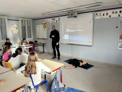 Ce lundi après-midi, la classe des CM2 a bénéficié d’une intervention en instruction civique (rôle et fonction du président de la république, du maire, missions de la police municipale…), mais également sur les gestes de premiers secours (se protéger, sécuriser, alerter, mettre une victime en position latérale de sécurité…). C’est M. Combe, policier municipal, qui a animé cette après-midi très instructive. Un grand merci à lui pour la qualité de son intervention.